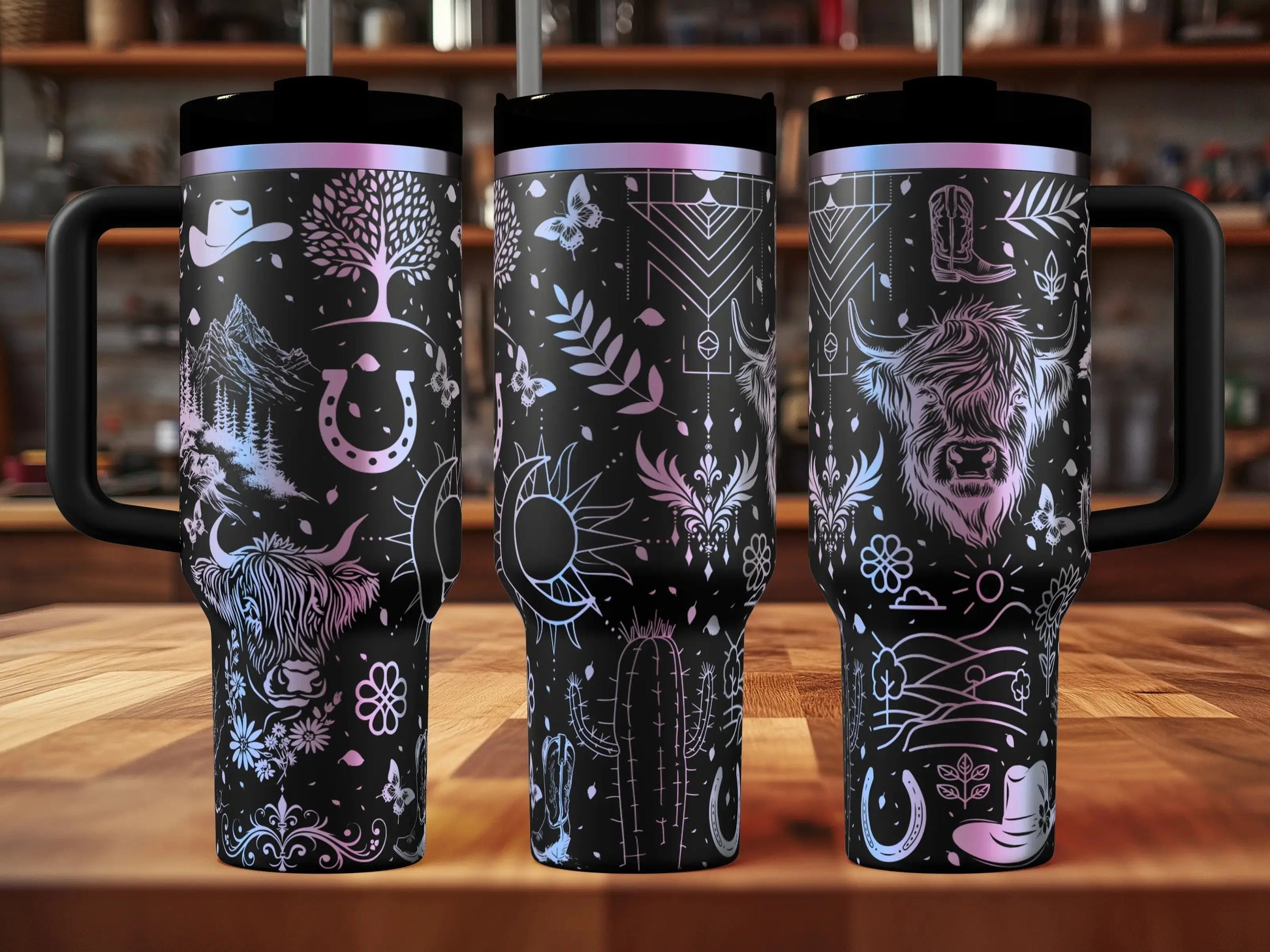 Calling all Highland Cow Fanatics! Show off your Western pride with our custom engraved Quencher Tumbler Available in 30 oz Stanley Dupe, 40 oz Stanley Dupe, and Genuine Stanley Branded variations featuring a Western Highland Cow theme. Unlike decals, our designs are laser etched onto the stainless steel and will last for the lifetime of the cup. Add a stainless steel or rainbow metal straw to your order for a complete set.