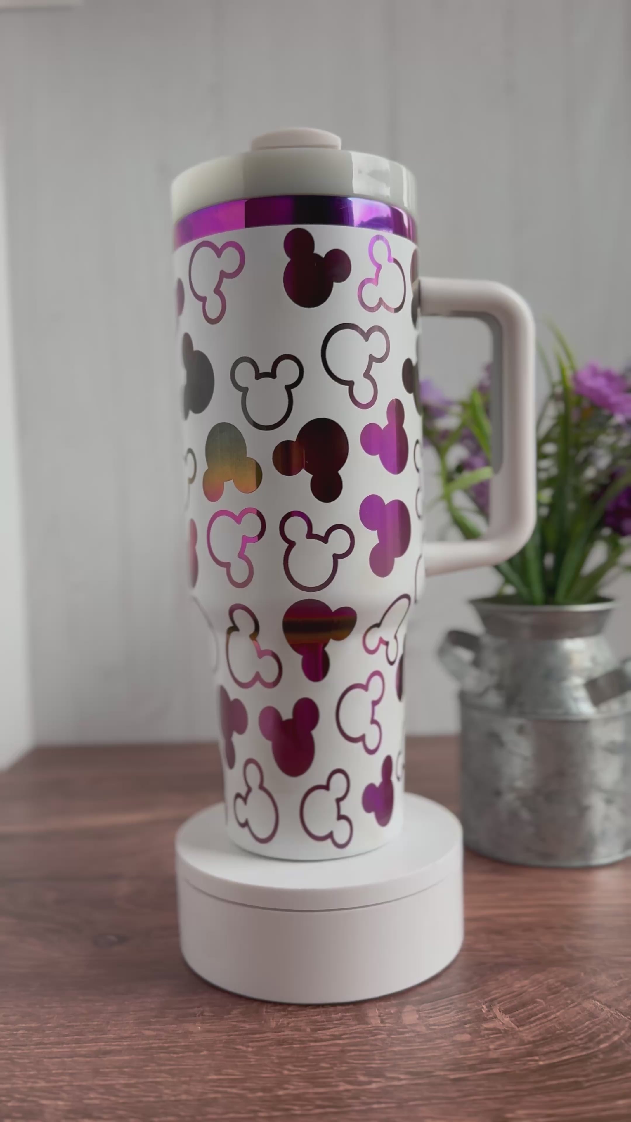Engraved and ready to ship. Only 1 available at this price. Mickey mouse pattern engraved on a white to purple hombre tumbler. You will receive this exact tumbler pictured.