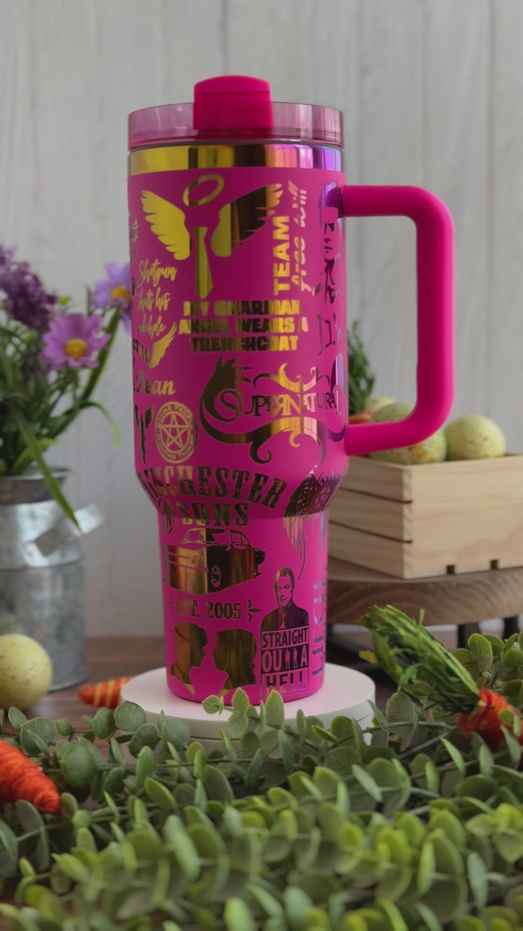Calling all Supernatural fans! Show off your tumbler game with our custom engraved Supernatural Quencher Tumbler Available in 30 oz Stanley Dupe, 40 oz Stanley Dupe, and Genuine Stanley Branded variations featuring a Supernatural Theme. Unlike decals, our designs are laser etched onto the stainless steel and will last for the lifetime of the cup. Add a stainless steel or rainbow metal straw to your order for a complete set.